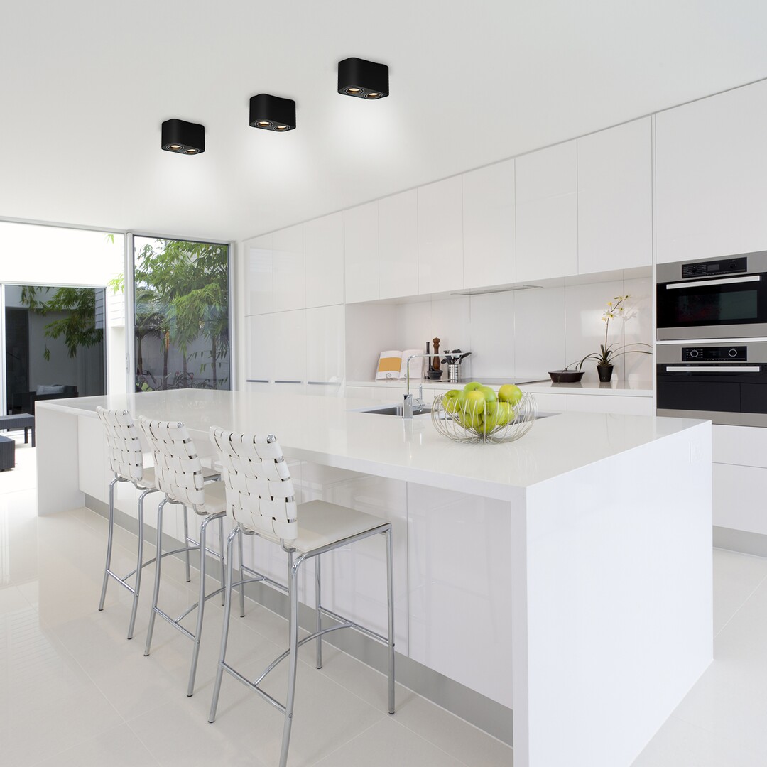 Lustra cu design minimalist Kobald cu 2 becuri este o alegere excelentă pentru camera de zi, dormitorul sau biroul modern. Acest model negru mat, pătrat, este realizat complet din aluminiu. Această lumină orientată în jos poate fi folosită cu două becuri de maximum 42 W. Tipul de soclu este GU10. Unghiul razei poate fi modificat cu 15° pentru ambele surse de iluminat, dacă este necesar. În funcție de încăperea în care montați Kobald, puteți alege becuri cu lumină albă caldă sau naturală. Lățimea corpului de iluminat de tavan de suprafață cu 2 becuri este de 180 mm, înălțimea 93 mm, lungimea 105 mm. Acest model este furnizat fără surse de iluminat.