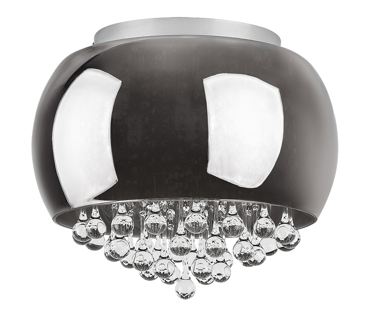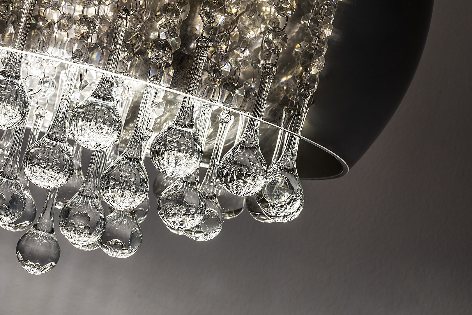 Corpul de metal cromat este complementat de un abajur de sticlă fumurie, o parte a acestuia acoperită de decorațiunea strălucitoare de sticlă cristal.