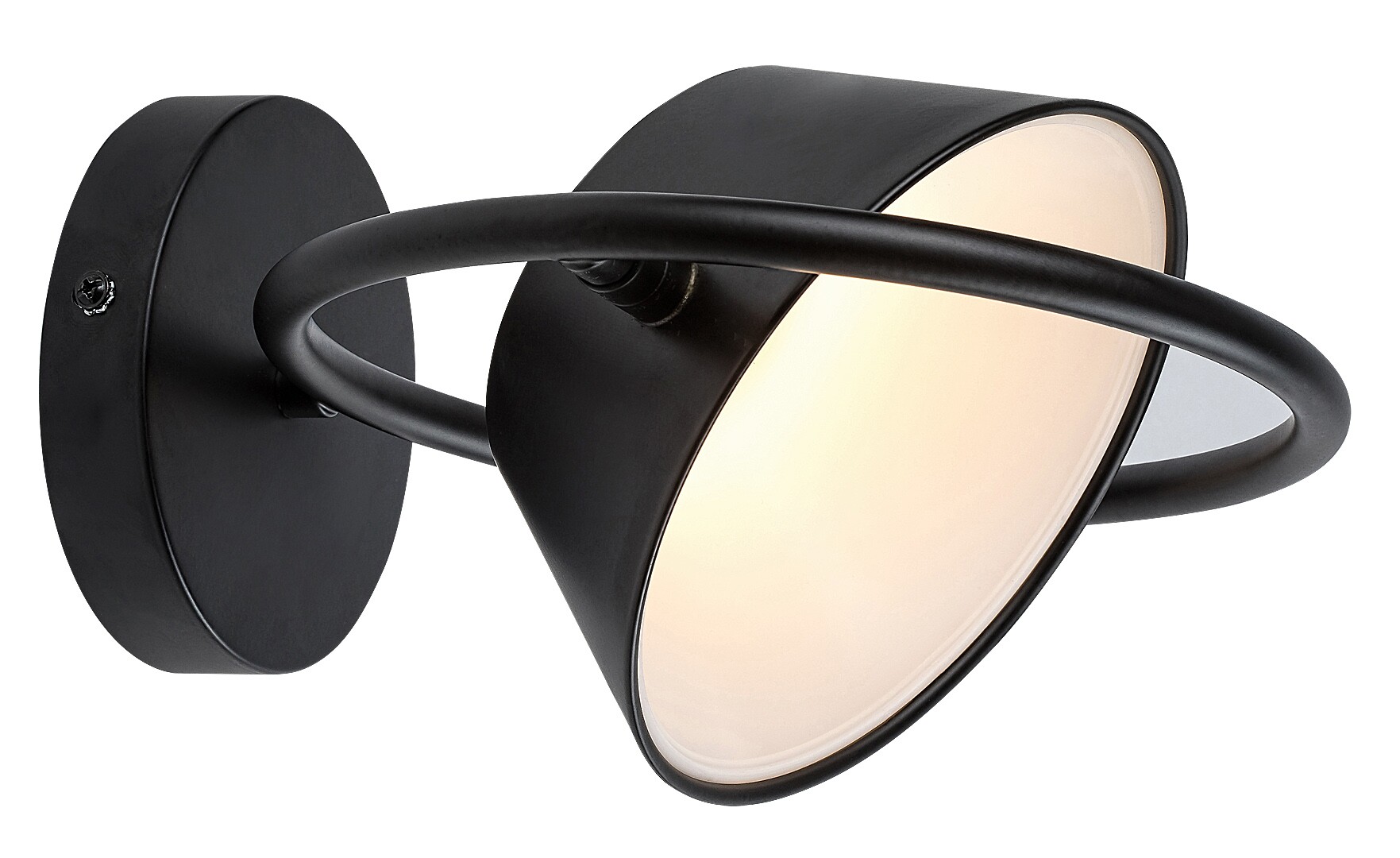 Lampa de perete Odiss, în stil modern, este recomandat în primul rând pentru camera de zi sau dormitor. Modelul realizat din metal de culoare neagră este completat de un abajur din plastic alb și poate fi fixat pe perete cu ajutorul unei baze decorative rotunde. Capul trapezoidal inversat al lămpii este atașat părții interioare a cadrului circular fixat pe baza decorativă. Unghiul capului lămpii este reglabil, astfel încât puteți direcționa lumina acesteia după preferințe. Odiss are o sursă de lumină LED încorporată aparținând clasei energetice G, cu o putere de 6 W, o luminozitate de 400 de lumeni cu abajur, 480 de lumeni fără abajur și cu o durată de viață într-adevăr excelentă: 36 000 ore! Sursa de lumină cu o temperatură de culoare de 3000 K emite o lumină albă caldă care ajută la crearea unei atmosfere intime și primitoare, fiind de asemenea ideală pentru relaxare. Dimensiunile lămpii de perete Odiss sunt următoarele: diametru 215 mm, distanța față de perete 250 mm, diametru abajur 150 mm, înălțime 70 mm, diametru de instalare 125 mm.