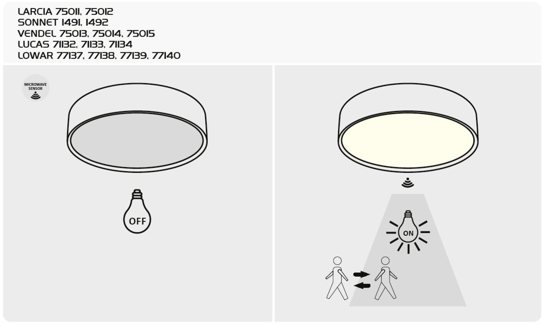Plafoniera rotundă Lucas cu senzor de mișcare reglabil cu microunde este un model universal: cu culoarea albă și aspectul discret, poate fi o alegere potrivită pentru camera de zi, dormitorul, bucătăria sau baia oricărei locuințe moderne. Lampa metalică este completată de un abajur din plastic alb. Lucas are o sursă de lumină LED încorporată cu o putere de 12 W, o luminozitate de 830 de lumeni cu abajur, 1200 de lumeni fără abajur și cu o durată de viață extraordinară: 50 000 ore! Sursa de lumină naturală albă, fără pâlpâire, are o temperatură de culoare de 4000 K. Acest model se laudă cu un indice de redare a culorii (CRI) de peste 80%, ceea ce este considerat extrem de bun. Protecția IP44 a lămpii Lucas garantează că aceasta este protejată împotriva pătrunderii particulelor solide cu diametrul mai mare de 1 mm, precum și împotriva stropirii cu apă din orice direcție. Diametrul plafonierei este de 265 mm, distanța față de tavan fiind de 100 mm.