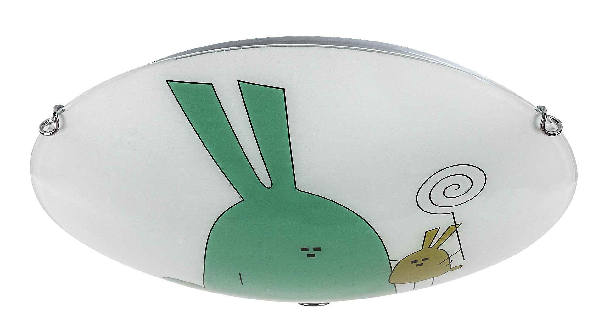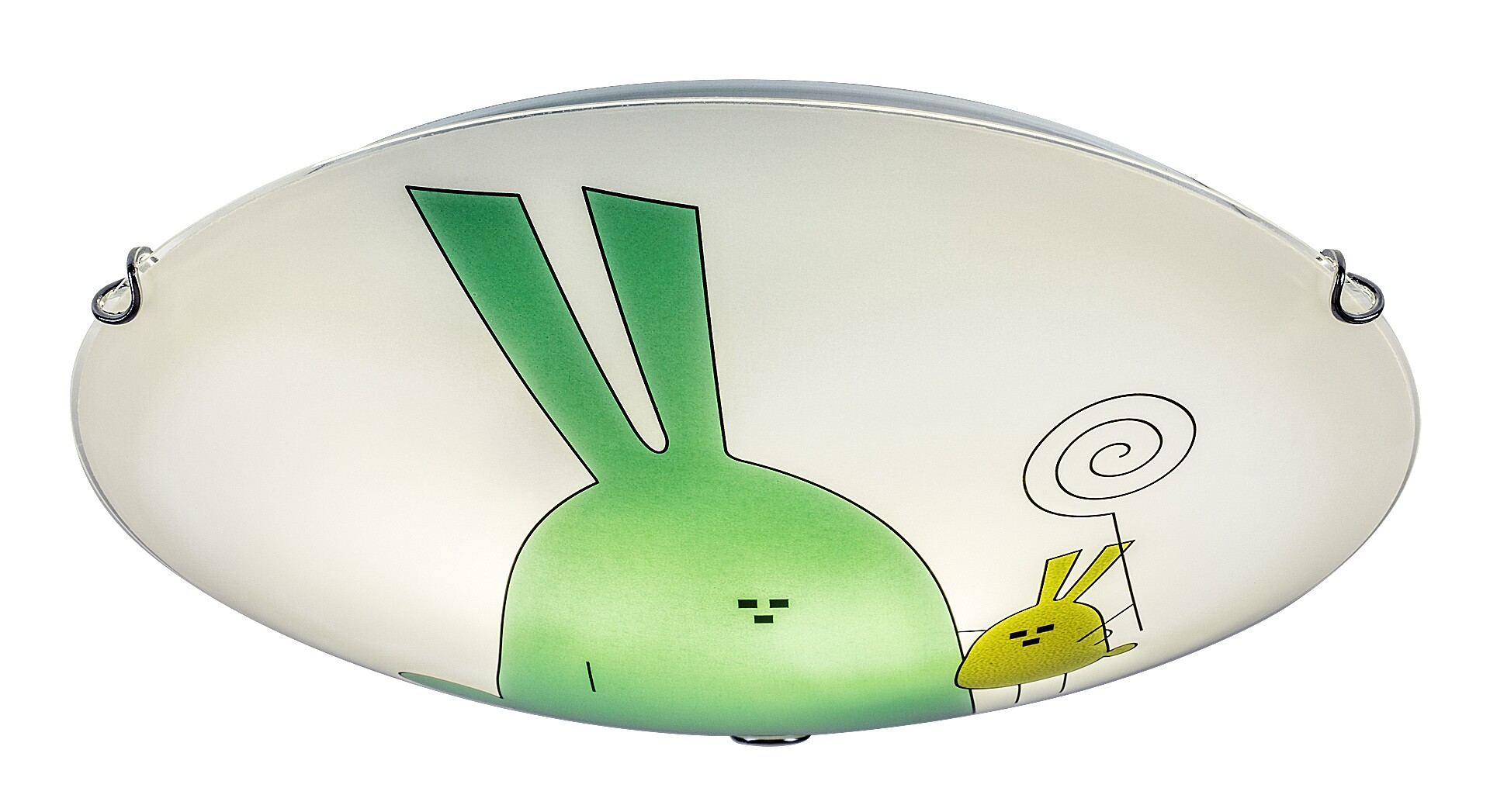 Plafoniera pentru copii Rabalux Flappy este un model creat de Rabalux. Este ideală pentru cei care doresc să facă camera copiilor și mai confortabilă, cu motive drăgălașe și încântătoare. Lampa este realizată în culoare albă, cu un suport metalic rotund și un abajur din sticlă. Abajurul este decorat cu un motiv stilizat și fermecător cu iepuraș, căruia nimeni nu-i poate rezista. Culorile dominante ale modelului sunt nuanțele vesele și proaspete de verde. Lampa pentru camera copiilor funcționează cu două becuri, fiecare de până la 60 W. Tipul de soclu este E27. Dacă dorești să accentuezi atmosfera intimă și confortabilă, alege surse de lumină cu lumină alb cald. Plafoniera pentru copii se livrează fără surse de lumină.