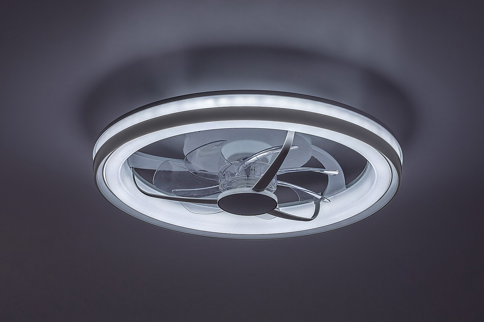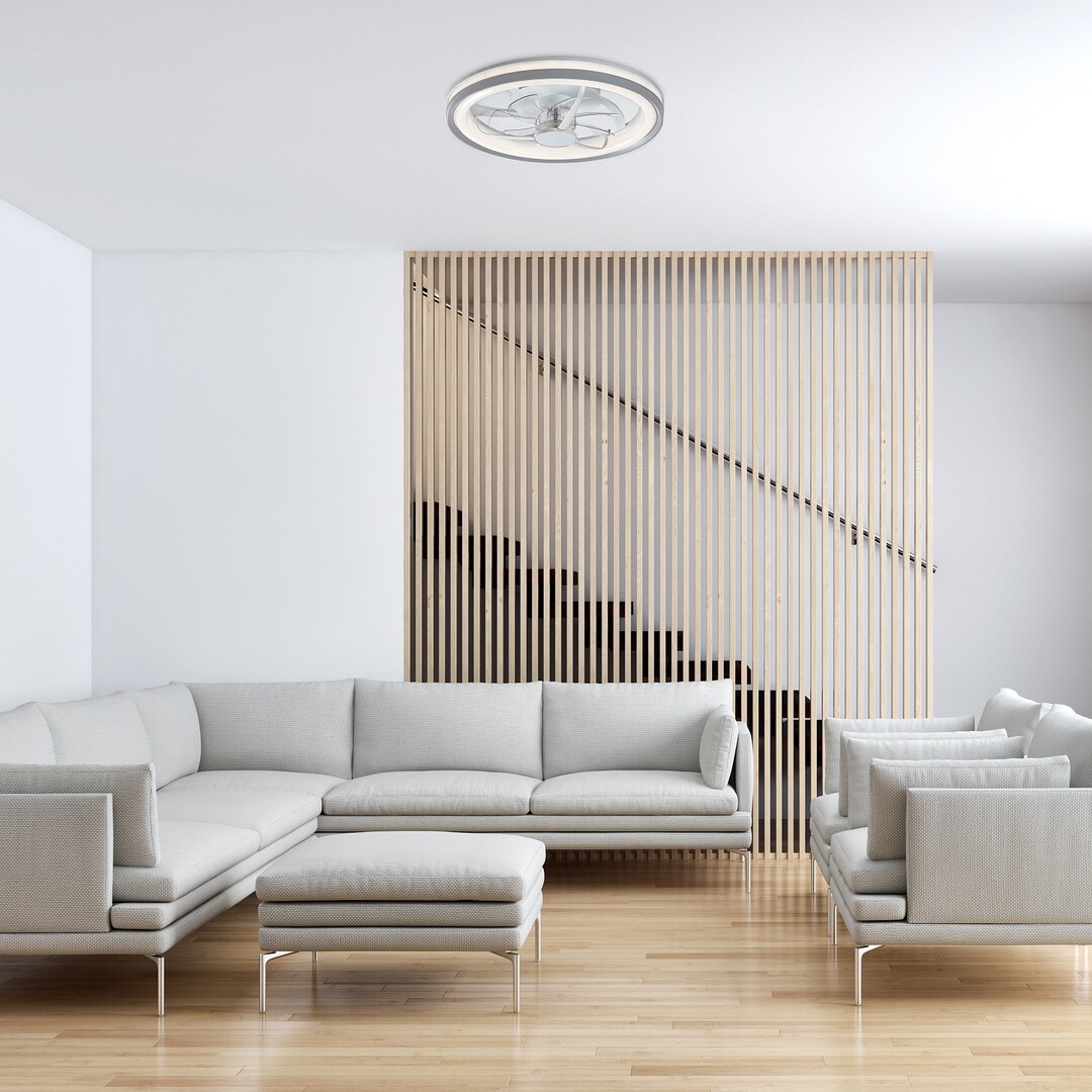 Rabalux Fanricius lampă de tavan cu ventilator este alegerea ideală pentru cei care caută o lampă cu o gamă largă de funcții. Lampa inteligentă are o sursă de lumină LED integrată, ceea ce asigură o funcționare eficientă din punct de vedere energetic și o durată lungă de viață. Pe lângă ventilator, există o serie de funcții pentru confort: temperatura culorii lampii poate fi modificată cu ajutorul unui telecomenzi sau a unui întrerupător de perete, iar luminozitatea, memoria, temporizatorul și funcția de lumină nocturnă pot fi reglate, de asemenea, cu telecomanda. Funcțiile inteligente ale lămpii 2 în 1 pot fi controlate și printr-o aplicație prin Wi-Fi. Lampa este realizată din plastic cu o bază rotundă de culoare argintie și un abajur alb, într-un stil funcțional. Puterea ventilatorului este suficientă pentru a răci camere de până la 12 m². Acest model este recomandat pentru living, dormitor sau birou.