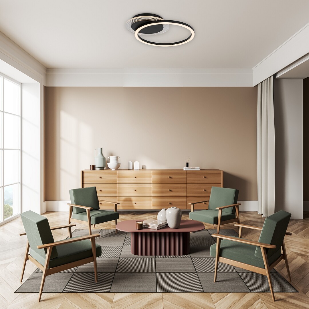 Plafoniera Rabalux Kerstin este alegerea ideală pentru cei care caută un model modern și eficient din punct de vedere energetic. Această lampă LED este realizată din metal, într-o stilată culoare neagră, și este completată de un abajur din acril alb. Structura este compusă din două elemente rotunde de dimensiuni diferite: cel mai mic, în formă de disc, servește și ca bază decorativă, iar elementul mai mare are forma unui inel. Aspectul armonios și designul curat al lămpii o fac potrivită pentru aproape orice locuință modernă. Plafoniera are o sursă de lumină LED integrată, care emite o lumină alb cald, susținând o atmosferă confortabilă și intimă. O recomandăm în special pentru sufragerie, dining sau dormitor. Datorită tehnologiei LED, acest model se remarcă printr-un consum eficient de energie și o durată lungă de viață.