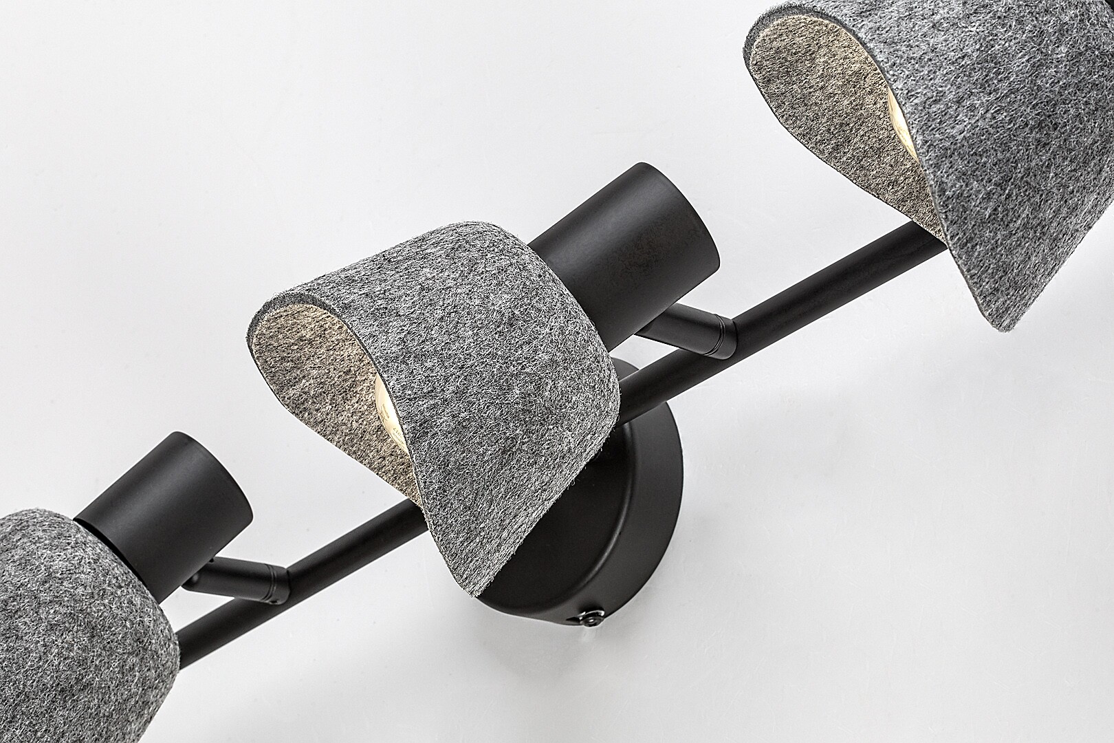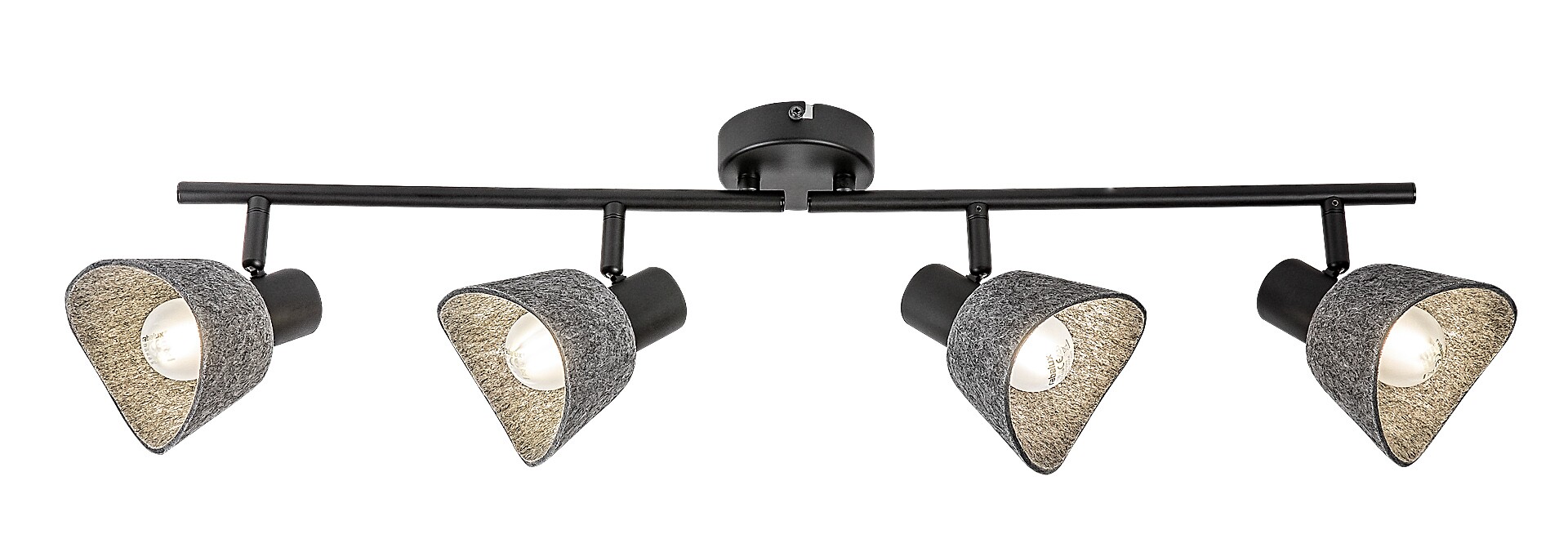 Rabalux Farelia spot de tavan cu 4 becuri este recomandat celor care caută un corp de iluminat cu un aspect unic pentru casa lor modernă, care să contribuie la crearea unei atmosfere plăcute. Acest model este realizat din metal negru, cu abajururi din fetru gri și poate fi fixat pe tavan prin intermediul unei baze decorative mici și rotunde. Materialul de fetru al abajurului este realizat din material reciclat, prietenos cu mediul. Capetele lămpii sunt susținute de o tijă cilindrică lungă. Forma curbată a abajururilor în formă de clopot, combinată cu materialul moale de fetru, oferă lămpii un aspect plăcut și primitor. Este alegerea ideală pentru living, dormitor sau birou. Poate fi utilizată cu patru becuri, fiecare cu o putere de până la 10 W. Tipul de soclu este E14. Spotul cu 4 becuri este prevăzut cu capete flexibile. Este livrat fără surse de lumină.