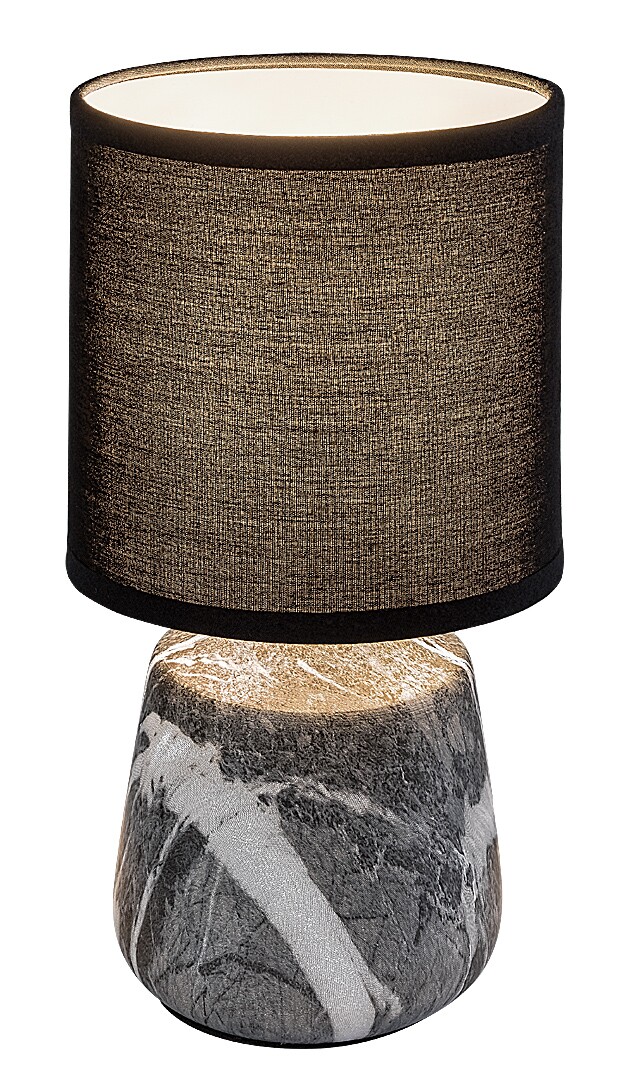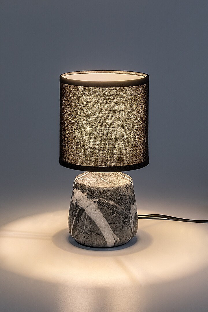 Lampa de masă Rabalux Nalisa este recomandată celor care apreciază lămpile cu un efect natural și un aspect armonios. Această lampă modernă de noapte dispune de un suport cilindric din ceramică cu efect de marmură gri și alb, completat de un abajur cilindric din material textil negru, deschis la partea superioară și inferioară. Este o alegere excelentă pentru dormitor sau living, fiind plasată pe noptieră sau pe o masă. Abajurul de culoare închisă oferă un iluminat discret, astfel că această lampă de masă este o alegere bună dacă trebuie să aprindeți lumina noaptea, dar nu doriți să deranjați partenerul. Poate fi utilizată cu un singur bec cu o putere de până la 40 W. Tipul de priză este E14. Lampa de noapte din ceramică vine cu un cablu textil negru și un întrerupător pe cablu. Este livrată fără sursa de lumină.