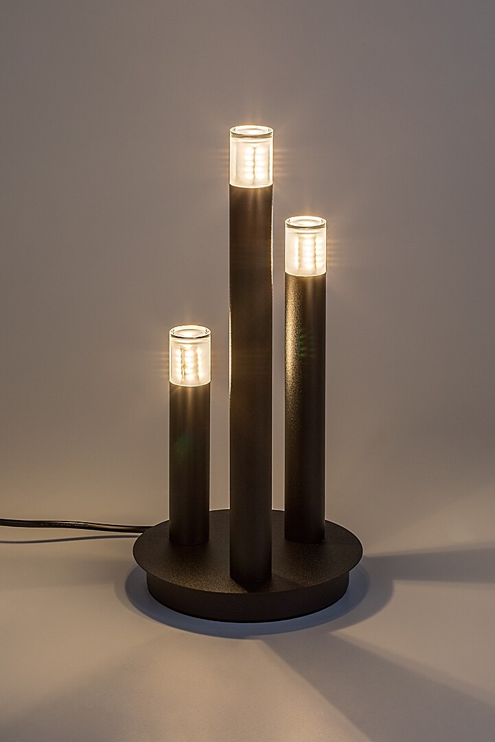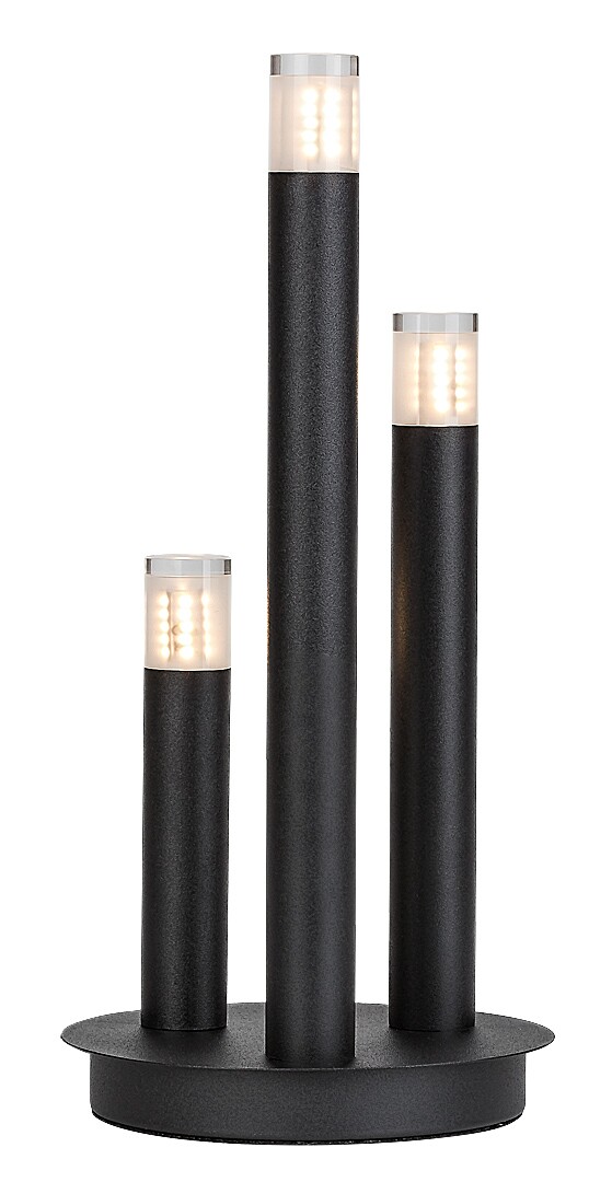 Lampa de masă Rabalux Ramira este alegerea ideală pentru cei care preferă un design unic și modele universale, ușor de mutat. Lampa este realizată din metal de culoare neagră elegantă, cu abajururi din acril transparent în partea superioară a capetelor lămpii. Baza decorativă are o formă rotundă, cu trei elemente cilindrice de lampă de înălțimi diferite, care amintesc de lumânări. Lampa de design poate fi plasată într-o varietate de camere din casa ta modernă: poate fi un plus stilat pentru living, bucătărie, sufragerie sau dormitor. Este operată printr-un comutator pe cablu și poate fi utilizată cu trei surse de lumină, fiecare cu o putere de până la 5 W. Tipul de soclu este G9. Poți alege becuri care emit lumină albă caldă sau naturală. Este livrată fără surse de lumină.