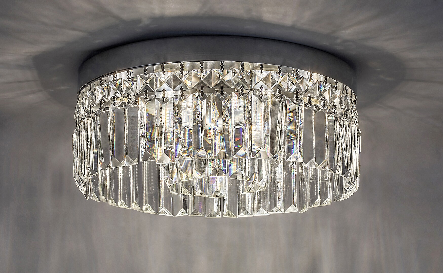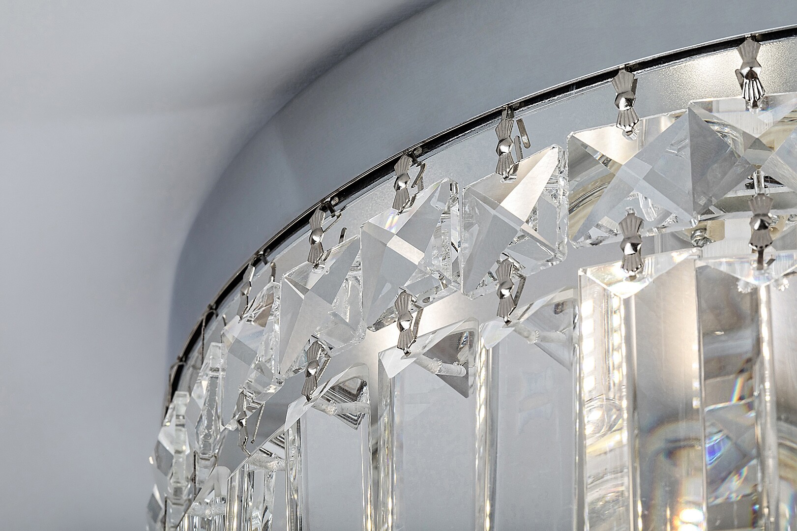 Plafoniera elegantă de baie Sybil, în stil clasic, poate fi o piesă elegantă și atrăgătoare pentru aranjamentul băii. Îl recomandăm în primul rând celor care preferă modelele strălucitoare și spectaculoase. Corpul din metal cromat al lămpii este decorat de pandantive din sticlă transparentă care acoperă sursa de lumină ca o perdea circulară, conferind acestui model un aspect de candelabru. Sybil poate fi fixat pe tavan cu ajutorul unei baze decorative rotunde cromate. Lampa poate fi folosită cu șase surse de lumină, fiecare cu o putere de până la 28 W, tip soclu G9. Dacă doriți să obțineți un efect curat și modern în baie, este recomandat să alegeți surse de lumină albă naturală pentru lampă. Protecția IP44 a lămpii Sybil garantează că acest model este protejat împotriva pătrunderii obiectelor solide mai mari de 1 mm, precum și împotriva stropirii cu apă din orice direcție. Diametrul plafonierei de baie este de 350 mm, distanța față de tavan fiind de 140 mm. Acest model se livrează fără surse de lumină.