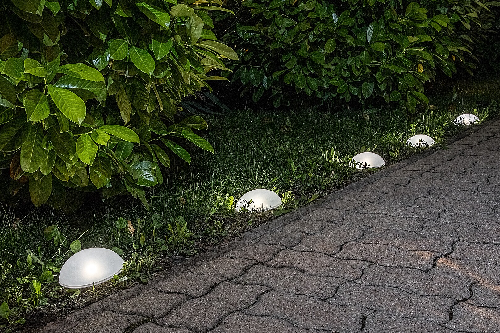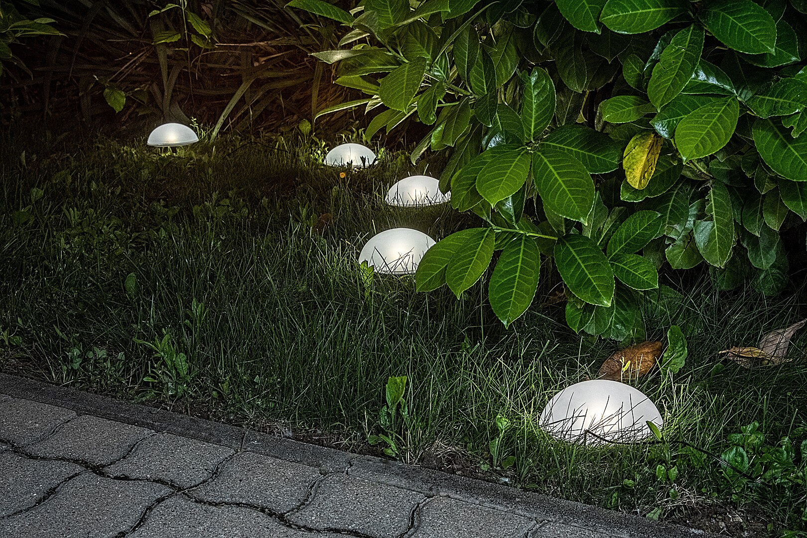Lampa solară Treppio cu fixare în pământ, în stil modern, reprezintă o soluție practică și estetică pentru iluminatul grădinii. Pe lângă unitatea care conține celula solară, modelul negru, care este realizat în întregime din plastic, constă din cinci lămpi rotunde legate în serie cu abajur alb. Treppio are surse de lumină LED încorporate cu o putere de 1 W, o luminozitate de 1,2 lumeni cu abajur, 6 lumeni fără abajur și o temperatură de culoare de 4000 K. Durata de viață a surselor de lumină, care emit o lumină albă naturală este de 20.000 de ore. Tensiunea bateriei este de 1,2V, iar capacitatea de 600 mAh. Lămpile își modifică luminozitatea în funcție de condiții. Dimensiunile lămpii Treppio prevăzută cu comutator sunt următoarele: lungime totală 4000 mm, înălțimea fiecărei lămpi 60 mm, diametru 150 mm. Protecția IP44 a lămpii cu fixare în pământ garantează că aceasta este protejată împotriva pătrunderii obiectelor cu diametrul de până la 1 mm, precum și împotriva stropirii cu apă din orice direcție.